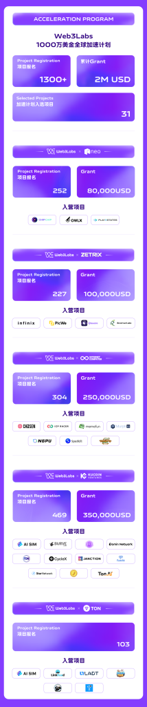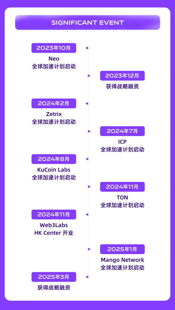 Web3Labs作为Web3.0创业一站式入口,目标响应香港特区政府政策宣言,通过落地服务、投资加速、技术合作、PR服务、助力合规等支持帮助全球Web3企业布局香港、链接国际。目前已在香港,新加坡,马来西亚,韩国,杭州,北京等地拥有线下孵化器。同时,Web3Labs推出了总额为1000万美元的WEB3.0全球加速计划,目前,已与Neo、Zetrix、ICP、KuCoin Labs、TON等多家国际头部机构达成战略合作,为全球优质项目提供全方位赋能与加速。