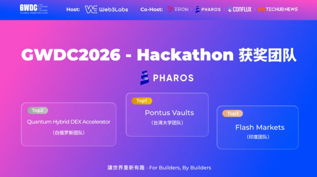 2026年2月7日至9日,由 Web3Labs 主辦,Tron、Pharos、Conflux、Techub News 聯合主辦的 GWDC 2026 全球 Web3 開發者大會(Global Web3 Dev Con 2026) 核心環節——國際黑客松(Hackathon),於香港數碼港成功舉辦。
