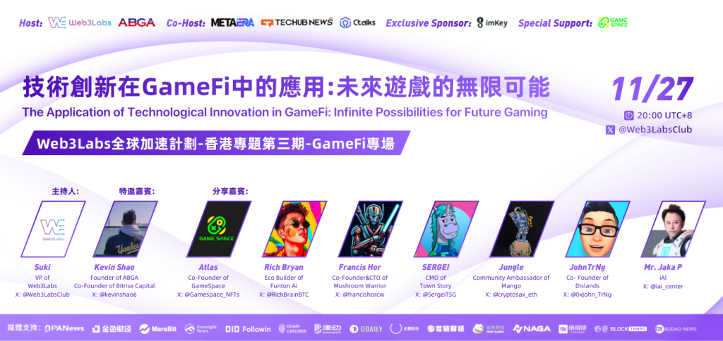 在此背景下,Web3Labs携手ABGA主办,联合MetaEra与Techubnews协办,共同筹备并成功举行了“Web3Labs全球加速计划香港专题第三期-GameFi专场”。此次Space旨在搭建一个跨越国界、集思广益的对话平台,邀请全球GameFi领域的行业先锋及技术创新者,共同挖掘并探讨技术创新如何重塑GameFi生态,开启游戏世界的全新纪元。